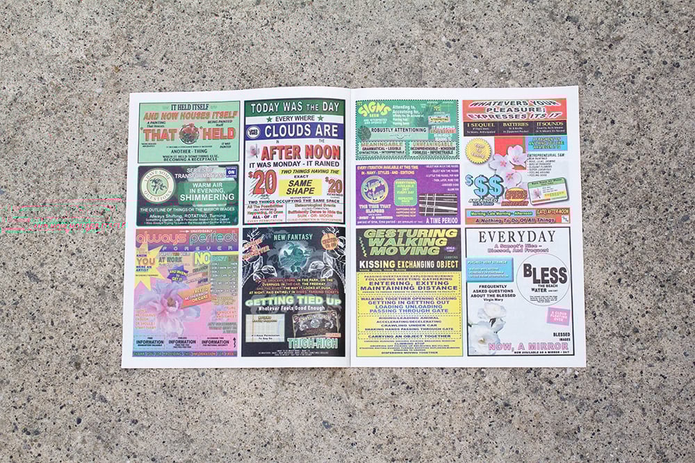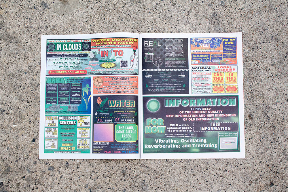 Alix Vollum meticulously replicates back page ads from the LA Weekly, inserting looping spirals of language fragments, found text from intragovernmental briefings and anonymous teen online role-play, and reflections on information, signs and meaning. In this overgrown text-image, "Paradise Rendezvous" fixates on the release of ecstasy though repetition, error, ambiguity, and a transcendence of design conventions.